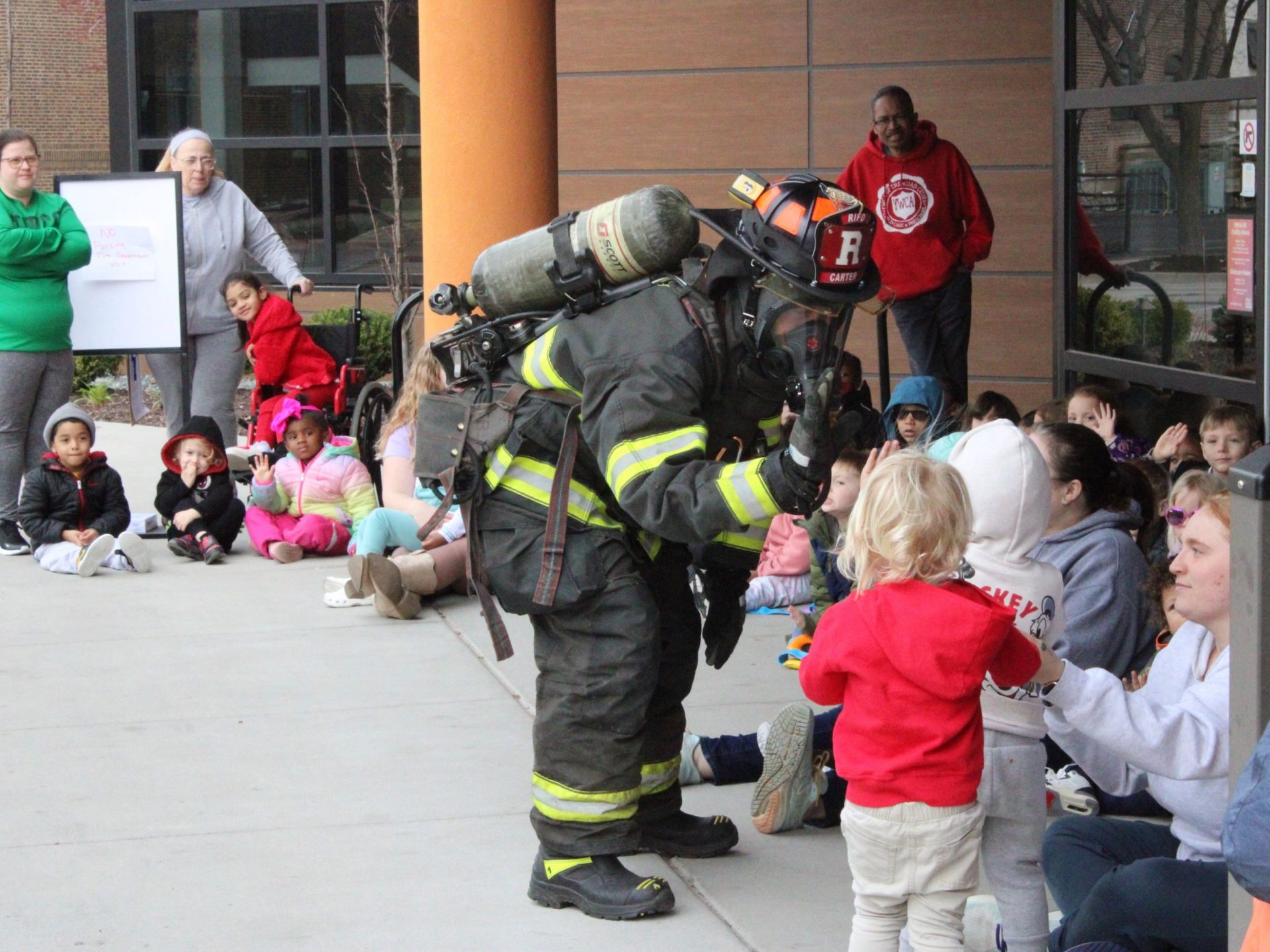 Wednesday’s theme was Work Together. Students participated in cooperative games and activities in their classrooms. We also had some special visitors! Firefighters from the Rock Island Fire Department stopped by to talk to students about their jobs, fire safety, and students got to check out a couple of fire engines and firefighting equipment.